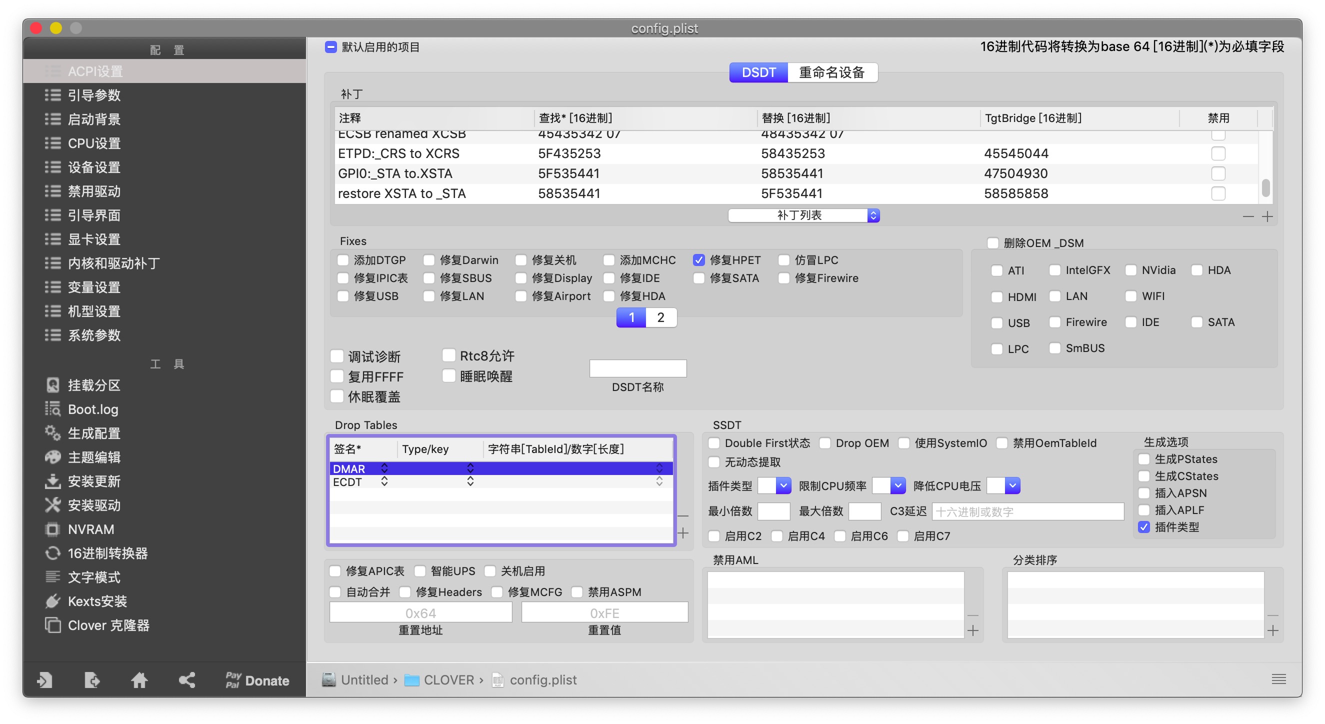 4.用Clover Configurator打开在EFI/CLOVER/config.plist文件,在ACPI的DSDT补丁添加以下值。