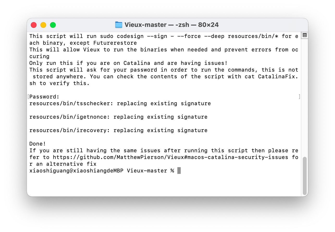 6.运行完之后:把Vieux-master/CatalinaFix.sh 这个文件拉进终端运行一次